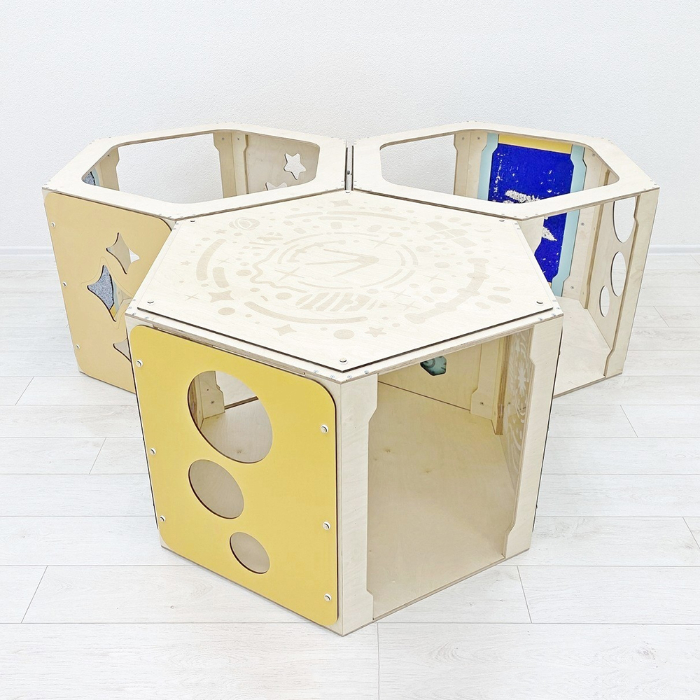 Внутри модули украшены тактильными панелями для развития сенсорной чувствительности, а снаружи – лазерной гравировкой и фигурными окошками. Они идеально стыкуются между собой и позволяют конструировать из них замки и лабиринты для маленьких непосед.