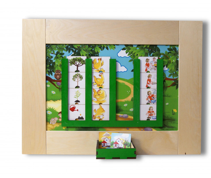 Модуль состоит из специальных пазов, в которые необходимо правильно поместить карточки с изображенными последовательными действиями. Ребенок должен рассортировать карточки не только по темам, но и в правильной последовательности.